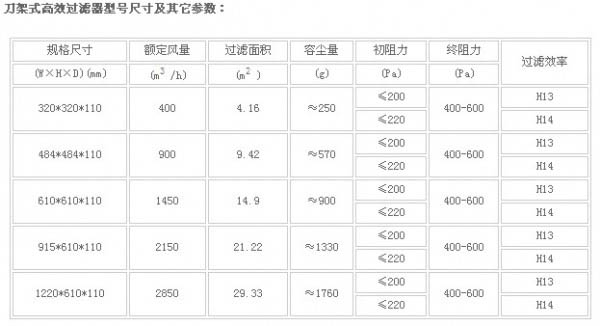 刀架式高效過濾器技術(shù)參數(shù)